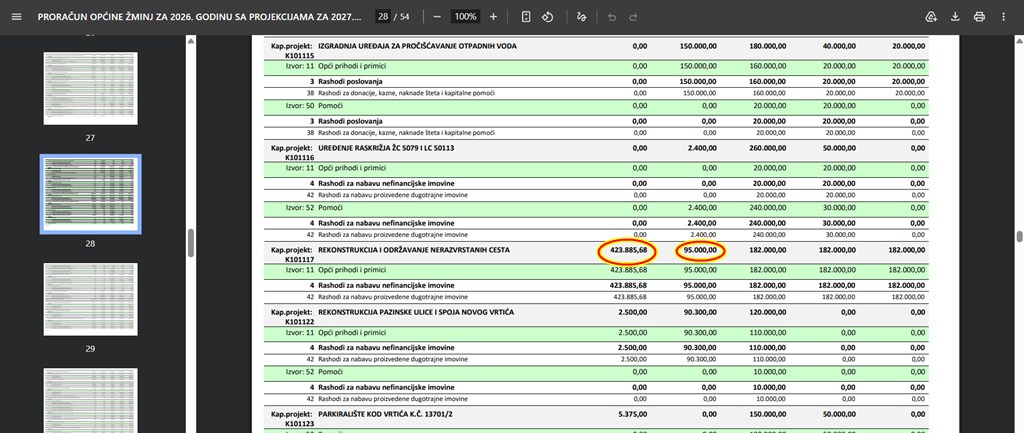 U proračunu za predizbornu 2024. godinu, Općina Žminj je na „rekonstrukciju i održavanje nerazvrstanih cesta“ potrošila 423.885 eura! U 2025. godini taj je iznos smanjen na 95 tisuća eura, a sada za 2026. je planiran na 182 tisuće eura.