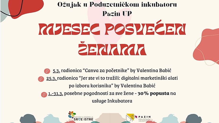 Poduzetnike i obrtnike u mjesecu ožujku u Poduzetničkom inkubatoru Pazin UP očekuje zanimljiv program, i razne promotivne pogodnosti, posebno za poduzetnice i obrtnice, s obzirom na nadolazeći Međunarodni dan žena.