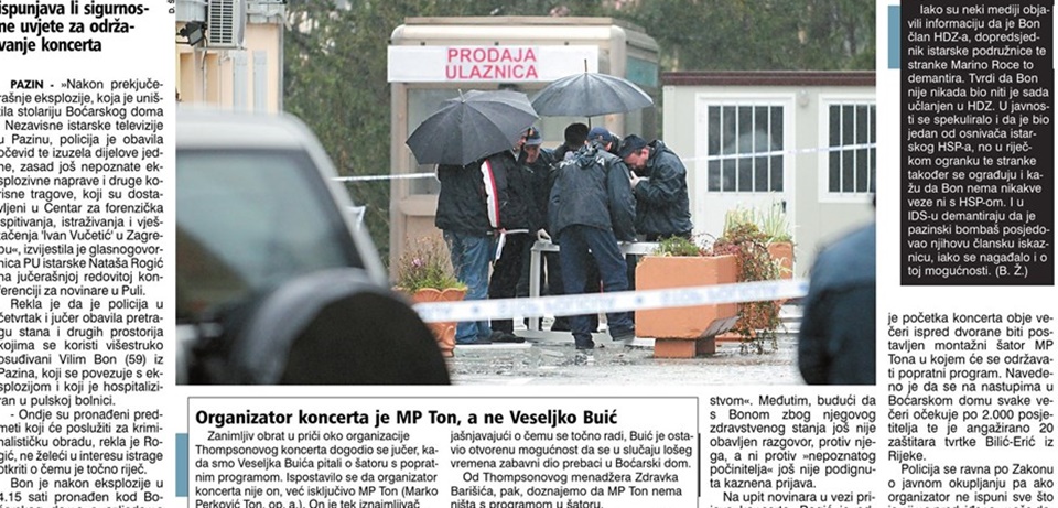 “Istarska antifašistička javnost očito se ne miri s najavljenim Thompsonovim nastupom u srcu Istre. Kao reakciju na najavljeni koncert kontroverznog hrvatskog patriot – metal sastava „Thompson“, u Pazinu će se 19.12. isto tako održati koncert na kojem će nastupiti skupine koje ne dijele potpuno stavove gore navedenog benda; poput „Kud Idijota“ i „Tito’s boys“. Organizatori nam jamče sadržajno bogat program uz performans (rušenje makete Arene petardama), društvenu igru „Thompsone ne ljuti se“, „Zabijanje mača u srce Istre“, te „Utrku na 100 m s preprekama od partizana“ Organizatori tog koncerta su bili istarske studentske udruge iz Istre i Zagreba”. Radi smanjenja tenzija od antikoncerta se nakon bombaškog napada odustalo.”