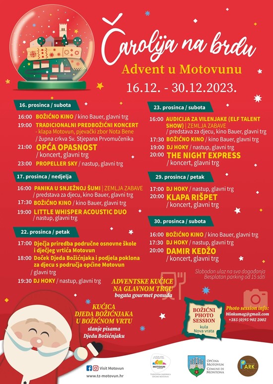 Na glavnom motovunskom trgu vas od 16.12. do 30.12.2022. godine očekuje prigodna gourmet ponuda na adventskim kućicama, kao i zabavni program sa sjajnim glazbenim izvođačima poput Opće opasnosti, The Night Express-a, Klape Rišpet, Damira Kedže, Klape Motovun, Little Whisper Acoustic Duo-a, benda Propeller Sky i DJ Hoky-a!
