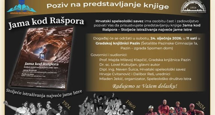 Gradska knjižnica Pazin i Hrvatski speleološki savez pozivaju javnost na predstavljanje knjige „Jama kod Rašpora – Stoljeće istraživanja najveće jame Istre“, vrijedne publikacije pripremljene i tiskane povodom obilježavanja 100. obljetnice dubinskog rekorda istraživanja…