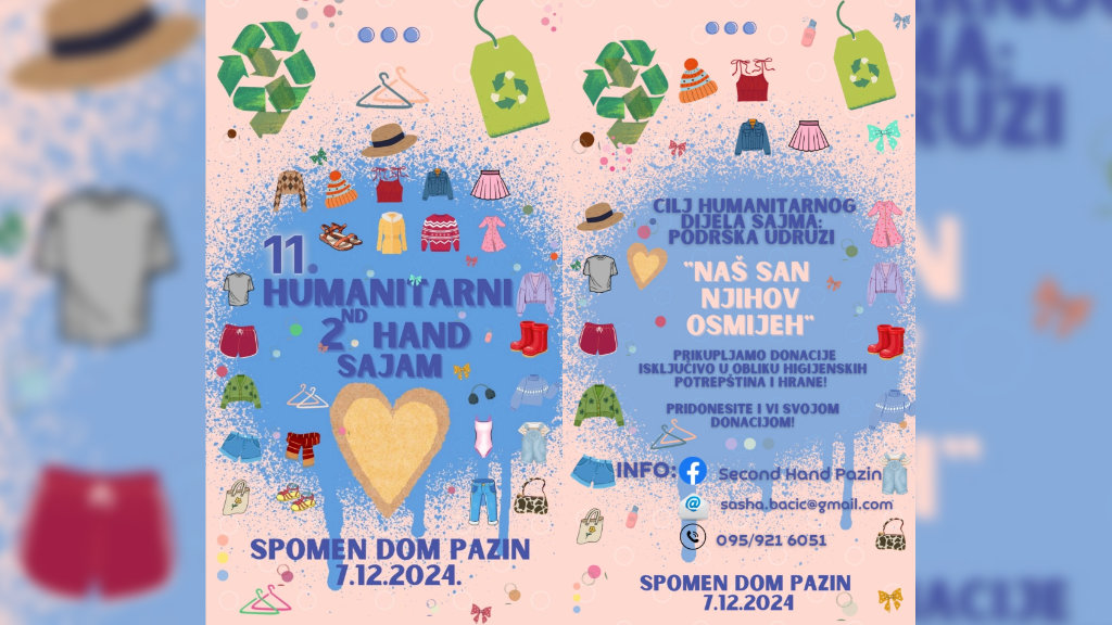 U subotu 7. prosinca 2024. godine zagrijanom holu Spomen doma u Pazinu održava se Second hand sajam na kojem su dobrodošli svi ljudi dobre volje sa svojim “viškom” iz ormar ili sa svojim ručno izrađenim predmetima.