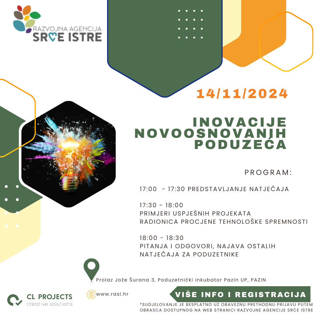 U četvrtak, 14. studenog s početkom u 17 sati u Poduzetničkom inkubatoru Pazin UP bit će predstavljene mogućnosti prijave na natječaje za poduzetnike do kraja 2024.