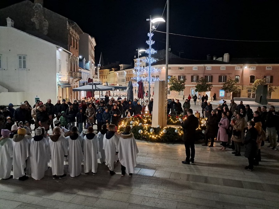 Istu večer, nešto ranije na Trgu slobode upaljena je druga adventska svijeća, gdje su se u prigodnom programu župljanima porečke župe pridružili gosti iz župe Nova Vas. Čast da upale drugu advenstku svijeću pripala je Luki i Ani Černac.