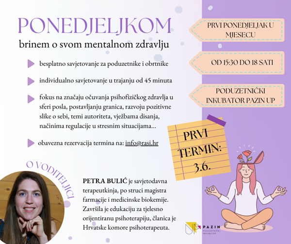 Poduzetnički inkubator Pazin UP u svibnju je pokrenuo besplatni program brige o mentalnom zdravlju poduzetnika i obrtnika, u sklopu kojeg će, kroz besplatna informativna predavanja, nuditi i mogućnost savjetovanja o temama iz područja mentalnog zdravlja i međuljudskih odnosa za poduzetnike i obrtnike sa područja središnje Istre.