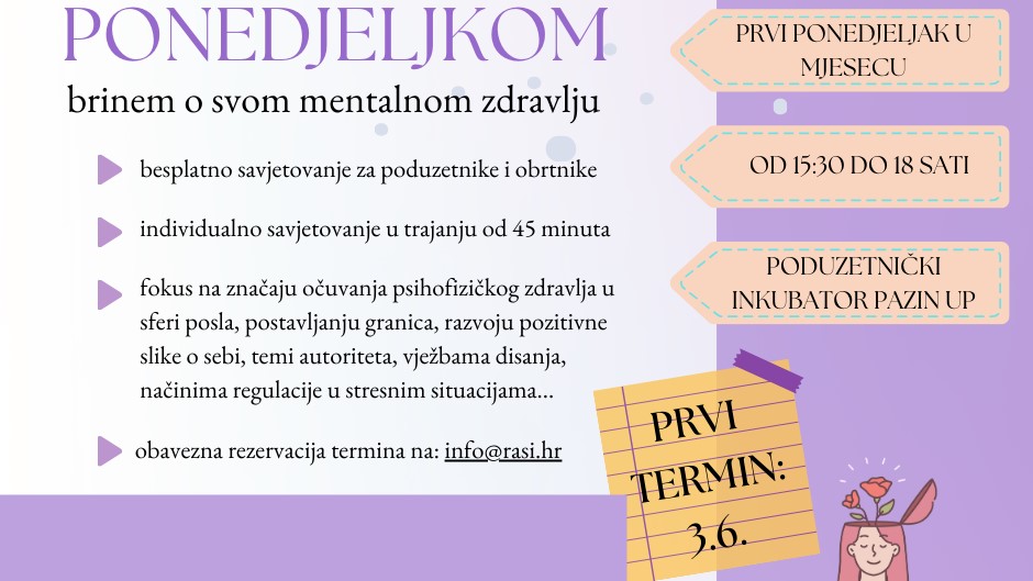 U ponedjeljak 3. lipnja započinje besplatno savjetovanje iz područja brige o mentalnom zdravlju za poduzetnike i obrtnike središnje Istre. Savjetovanje je namijenjeno svima koji teško balansiraju privatni i poslovni život, teško se nose s poslovnih neuspjehom i stresnim situacijama, strahuju da će se pritisak na poslu odraziti na njihovo zdravlje.