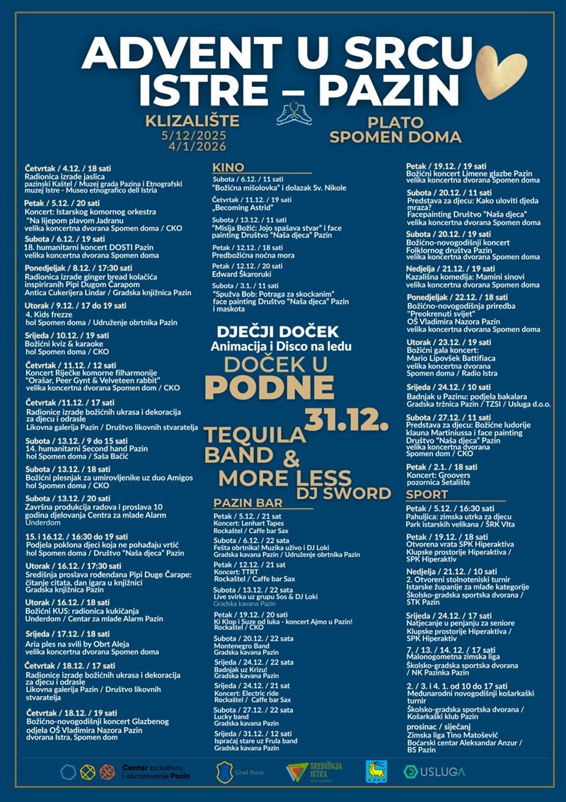Advent u srcu Istre – Pazin donosi više od pedeset kulturnih, zabavnih, dječjih, glazbenih i sportskih događanja tijekom cijelog prosinca, s posebnom novosti da se većina programa – osim klizališta – seli u toplo okruženje Centra za kulturu i obrazovanje Pazin (Spomen dom), čime će posjetitelji dobiti još ugodnije i sadržajnije blagdansko iskustvo.