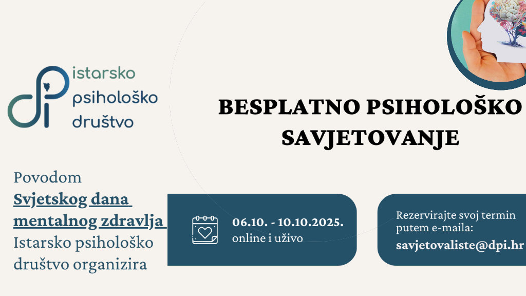 U sklopu kampanje, članice Istarskog psihološkog društva nude besplatne termine psihološkog savjetovanja (u trajanju od 1 sata), uživo ili online, u razdoblju od 6. do 10. listopada 2025. godine. Termini se mogu rezervirati putem e-maila savjetovaliste@dpi.hr.