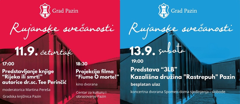 Večer je rezervirana za projekciju filma „Fiume o morte!“ redatelja Igora Bezinovića u Kino dvorani Centra za kulturu i obrazovanje Pazin, u 18:30. Film, hrvatski kandidat za Oscara, kroz inovativan pristup donosi rijetko prikazanu povijesnu epizodu okupacije Rijeke.