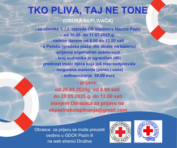 Gradsko društvo Crvenog križa Pazin organizirati će obuku neplivača „Tko pliva taj ne tone“ za učenike 1. i 2. razreda Osnovne škole Vladimira Nazora Pazin (matična i područne).