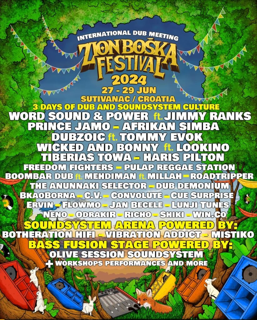 Treće izdanje Zion Boška festivala će se održati od 27. do 29. lipnja u maloj uređenoj šumi nedaleko od sela Sutivanac u središnjoj Istri. Kao i prijašnjih godina, festival će u šumi Zion Boška ugostiti velikane iz svijeta duba, nekoliko soundsystema i domaće snage dub i bass scene na dva floora uz dnevni i noćni program.