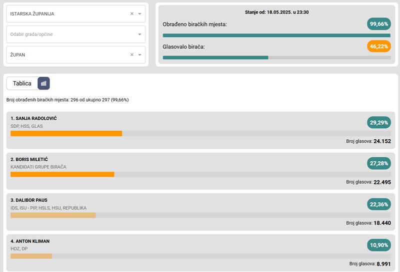 Zanimljivo, u županijskoj skupštini je drugačije. IDS sa svojim partnerima dobio je 30.37%, a SDP 26.31%. Slijedi Miletićeva lista s 16.91%, a HDZ ima 11.92%.