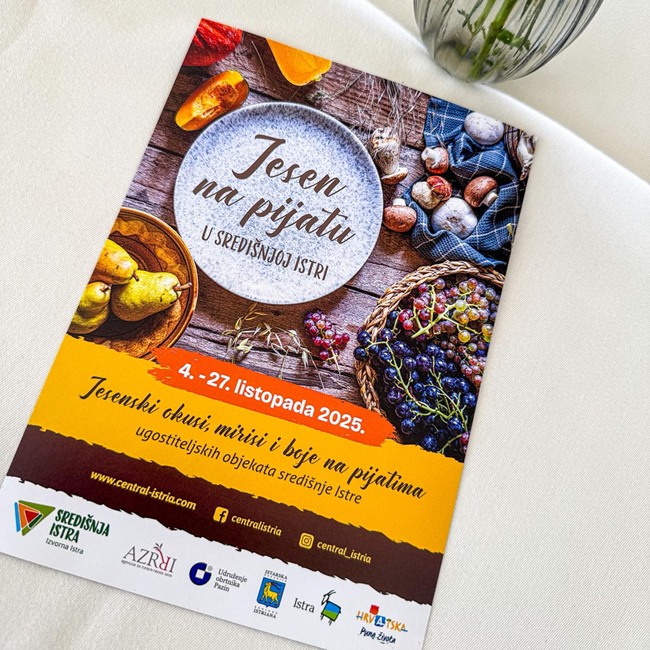 Manifestacija Jesen na pijatu u središnjoj Istri odvijat će se od 04. do 27. listopada 2025. u ugostiteljskim objektima na području TZ središnje Istre. U navedenom razdoblju, svaki dan u redovnom radnom vremenu, ugostitelji će nuditi razna tradicionalna jela istarske kuhinje spravljena od jesenskih namirnica našeg podneblja, a sve u cilju jačanja gastronomske ponude središnje Istre te daljnjeg povezivanja OPG-ova i ugostitelja u razdoblju posezone.