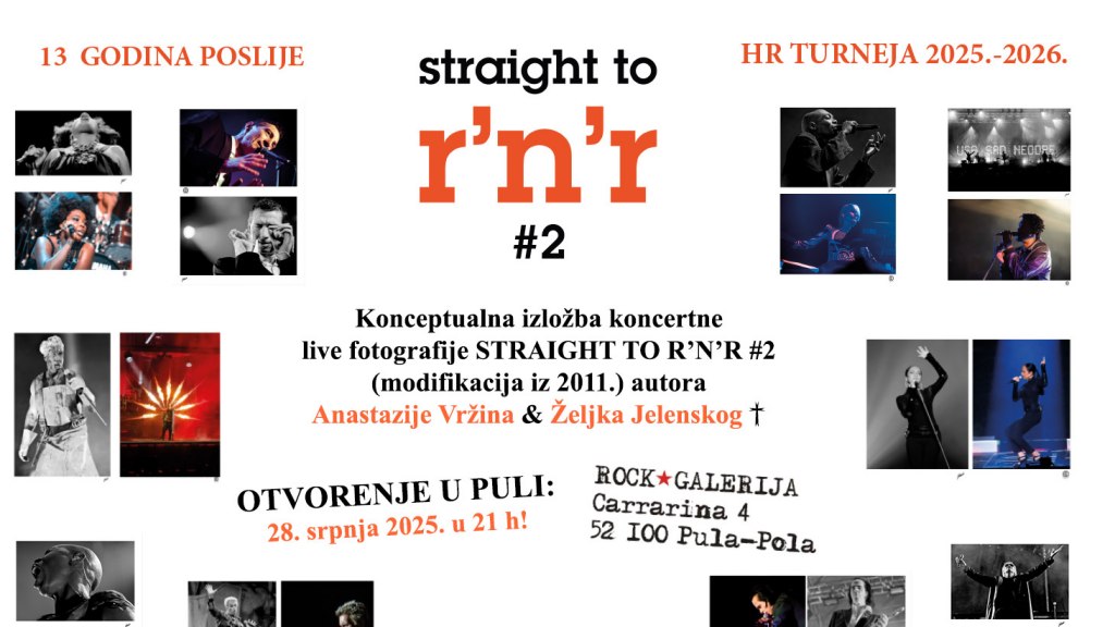 Nakon premijere izložbe „Straight to r’n’r #2“ održane 29. svibnja u Nezavisnom kulturnom centru Azimut u Šibeniku, ovaj hvaljeni fotografski projekt seli se u srce Istre – Pulu, gdje će ga ugostiti Rock galerija. Otvorenje izložbe najavljeno je za 28. srpnja u 21 sat, a postav će biti dostupan do 14. kolovoza, nakon čega se seli na Kvarner, u Novi Vinodolski.