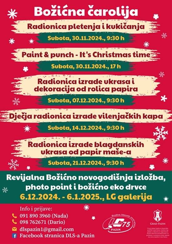 Društvo likovnih stvaratelja Pazin pripremilo je mnoštvo događanja s sklopu programa Božićne čarolije, kojom će obogatiti adventski program Grada Pazina i donijeti dašak blagdanskog ugođaja u ulicu Jurine i Franine u kojoj se nalazi LG galerija.