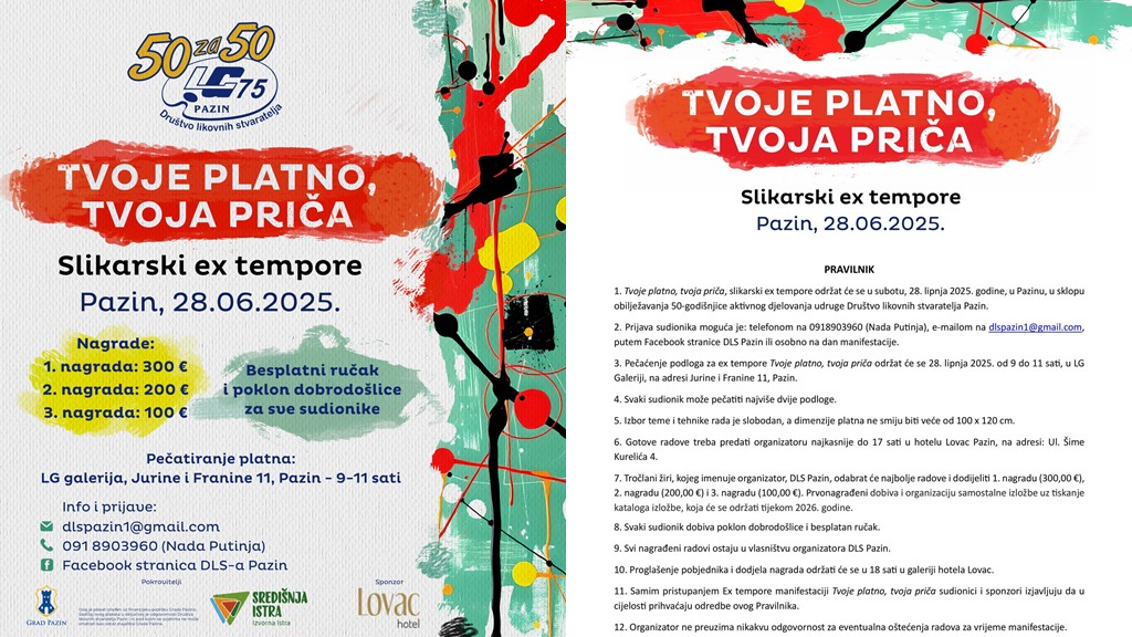 Društvo likovnih stvaratelja Pazin ove godine slavi veliki jubilej – 50 godina djelovanja i tim povodom obnavlja svoju omiljenu slikarsku manifestaciju Ex Tempore, pod simboličnim nazivom “Tvoje platno, tvoja priča“.