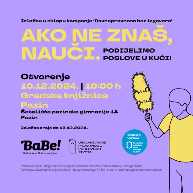 Kroz kampanju nastoje potaknuti širu društvenu raspravu i podići svijest o ravnomjernijoj raspodjeli kućanskih poslova, a bit će otvorena za posjetitelje/ice do petka, 13. prosinca 2024.
