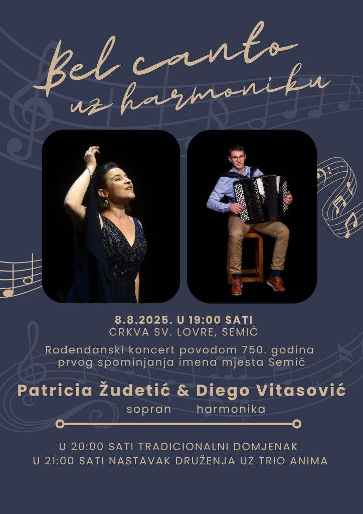 Sutra (petak) s početkom u 19 sati u crkvi Svetog Lovre održat će se rođendanski koncert klasične glazbe „Belcanto uz harmoniku“ u izvedbi mlade operne pjevačice Patricije Žudetić i vrsnog harmonikaša Diega Vitasovića, a nakon koncerta uz prigodni domjenak zabava se nastavlja uz Trio Anima Band.