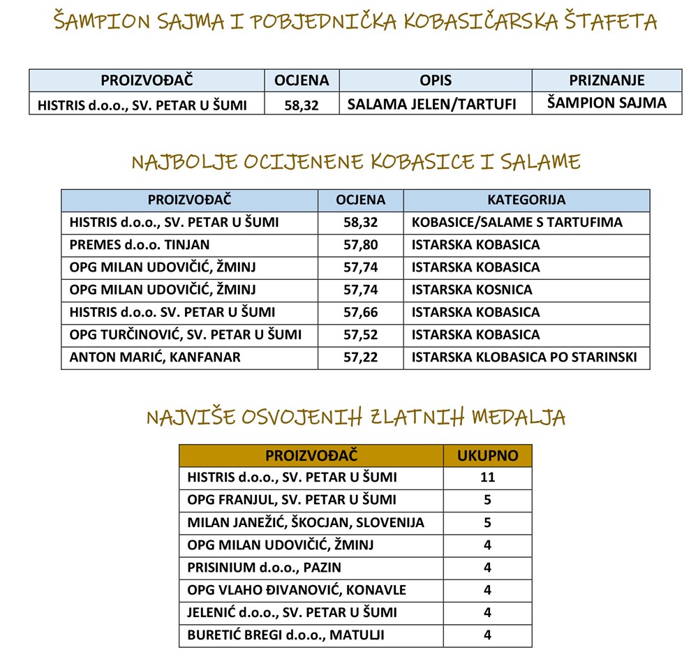 Kobasičarska šampionska štafeta ponovno ostaje u Istri i Sv. Petru u Šumi! Stručno povjerenstvo od 20 ljudi najviše bodova dodijelilo je supetarskom proizvođaču Histris za salamu od jelena s tartufima. Ovo je drugi put za redom da na „Danima hrvatskih kobasica i salama“, natjecanju uoči tradicionalnog sajma „S klobasicom u Europu“, pobjedu za isti proizvod odnosi Histris. U povjerenstvu ističu kako je to dokaz kontinuiteta i kvalitete, ali i kako žiri ne odstupa od strogih kriterija.