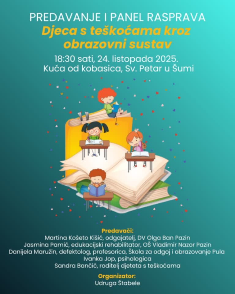 Obavještavamo vas da Udruga žena „Štabele“ dana 24. listopada 2025. godine (petak) organizira panel-raspravu na temu „Djeca s teškoćama kroz obrazovni sustav“.