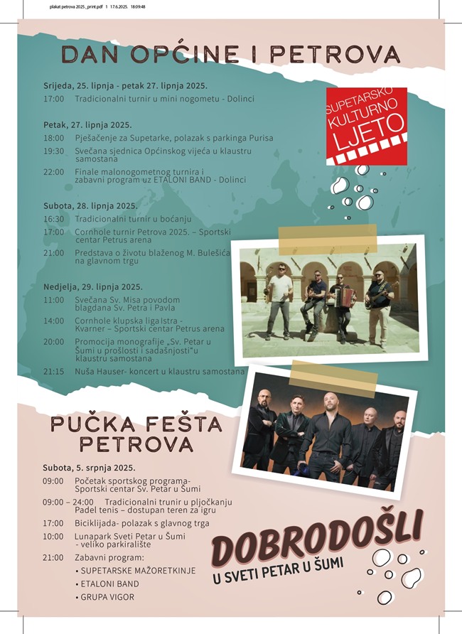 No, i nedjelja je dan kada se obilježava Dan Općine. U 11 je Svečana misa povodom blagdana Sv. Petra i Pavla, a od 14 sati kreće cornhole liga da bi u 20 sati bila promocija monografije „Sveti Petar u Šumi u prošlosti i sadašnjosti“.