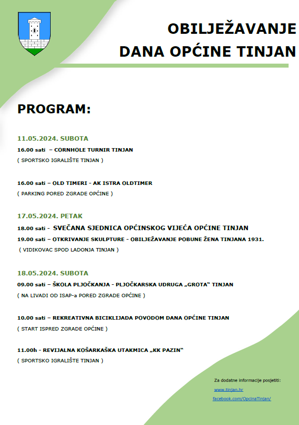 Program povodom Dana općine nastavlja se u petak 17. svibnja kad je za 18 sati predviđeno održavanje svečane sjednice općinskog vijeća Općine Tinjan, dok će nakon sjednice, u 19 sati, na vidikovcu spod ladonja u Tinjanu biti upriličeno otkrivanje skulpture povodom obilježavanja pobune žena Tinjana 1931. godine.
