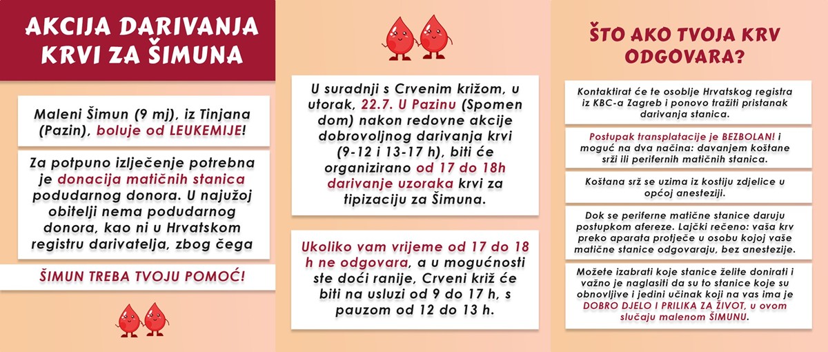 Oni koji su u mogućnosti molimo da to isto učine već ovog utorka 22.7.2025. u Pazinu u Spomen domu od 17 do 18h. U suradnji s Crvenim križom, u utorak 22.7. nakon redovne akcije dobrovoljnog darivanja krvi (9-12 h i 13-17 h) biti će organizirano od 17 do 18 h darivanje uzoraka krvi za tipizaciju za malenog Šimuna. Ukoliko vam navedeni termin ne odgovara, a u mogućnosti ste doći ranije tog dana, Crveni križ će biti na usluzi od 9 do 17 h, s pauzom od 12 do 13h.