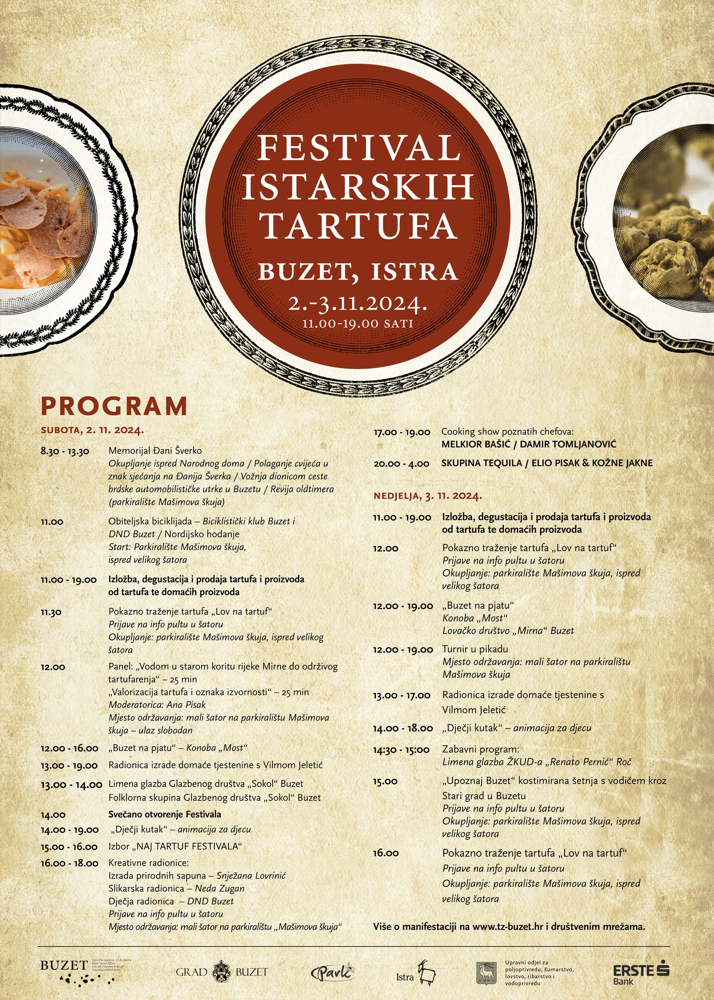 Program započinje u subotu u jutarnjim satima s mini-pustolovnom utrkom “Lov na tartuf“, koja već godinama privlači entuzijaste i rekreativce. U subotu u 15 sati, održat će se izbor “Naj tartufa”, a od 16 do 18 sati održat će se i brojne kreativne radionice. Od 17 do 19 sati na rasporedu je Cooking show poznatih chefova Melkiora Bašića i Damira Tomljanovića.